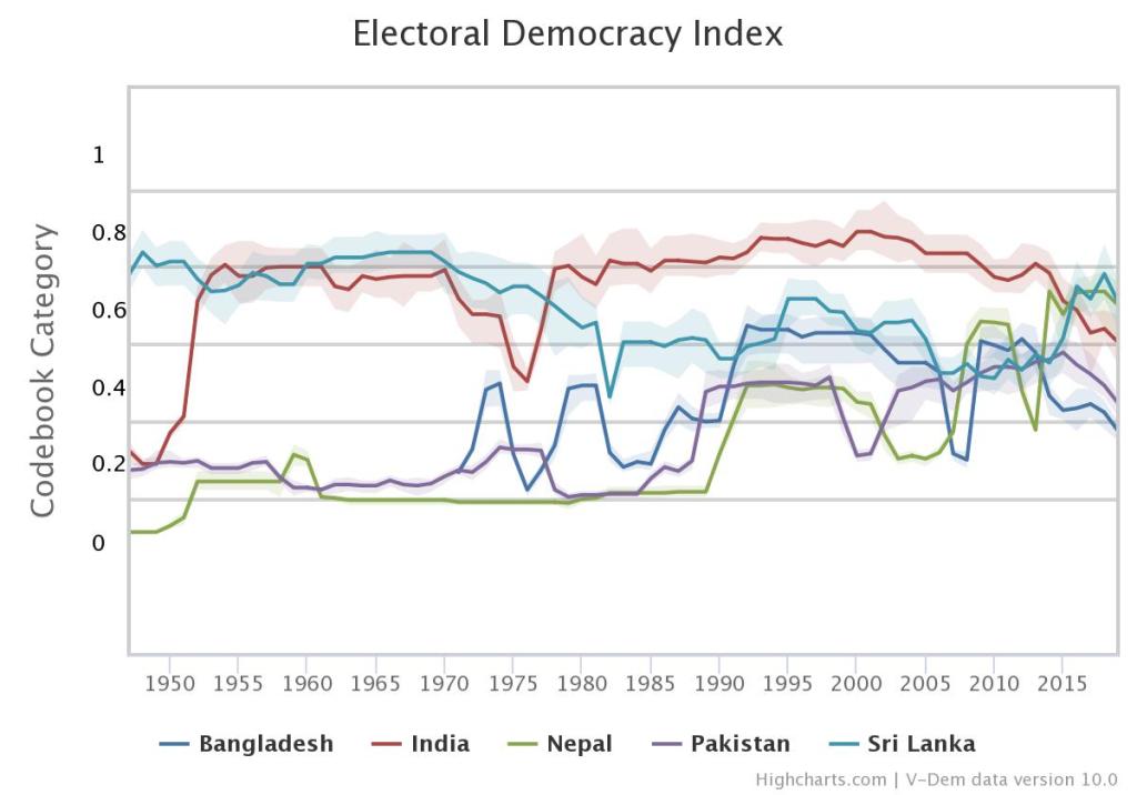 I discussed some of these dynamics in this Foreign Affairs article last year, and 2019 seems to have largely borne its basic claims out: elections occur, and are definitely meaningful and important, but the broader infrastructure of limits on state power and equal application of the rule of law remains quite weak in much of the subcontinent. In Pakistan, the military’s deep ongoing influence is impossible to ignore. In India, Sri Lanka, and Bangladesh, we see a combination of dominant, majoritarian (in the broad sense) political parties and politicized state apparatuses. This is a matter of pride for some in the region, who herald a new era of strong states, “tough” measures to maintain sovereignty, and resurgent nationalism. For those less excited about what accompanies this trend, there is plenty of cause for concern despite ongoing elections. Regardless of your views, V-Dem’s data and visualization tools are well worth checking out.