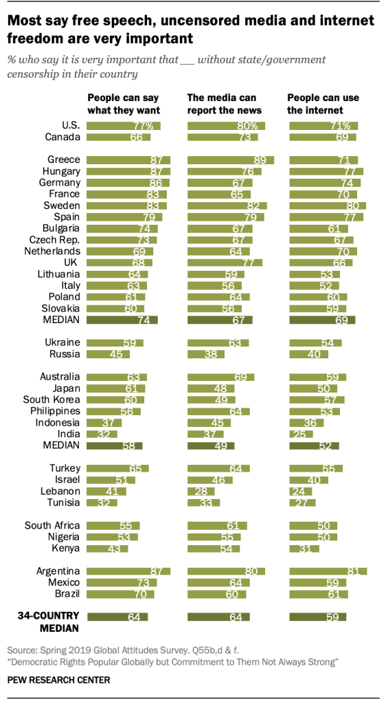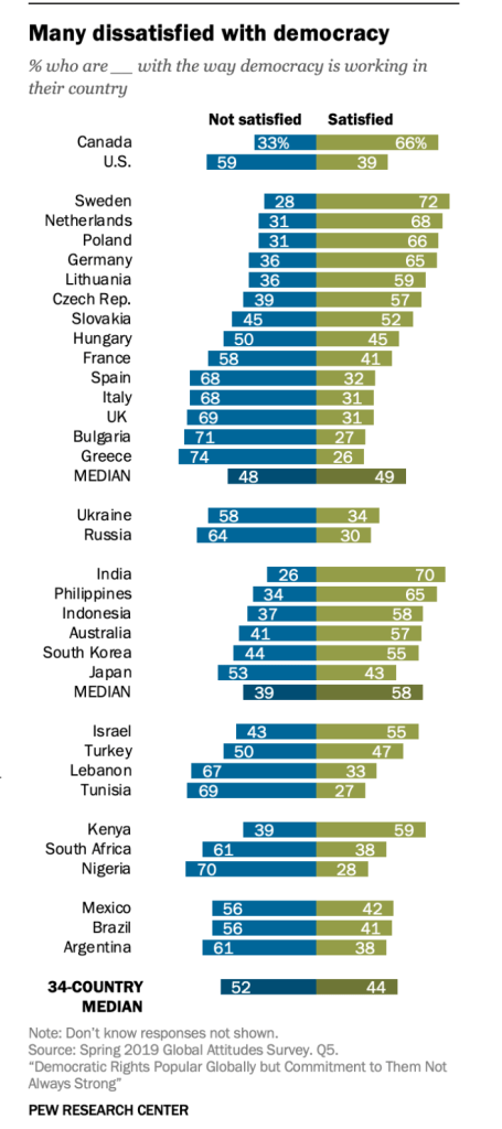 One productive way to take on this disjuncture comes from a 2019 Pew survey. This figure on the high level of satisfaction with democracy in India has been making the rounds on twitter: