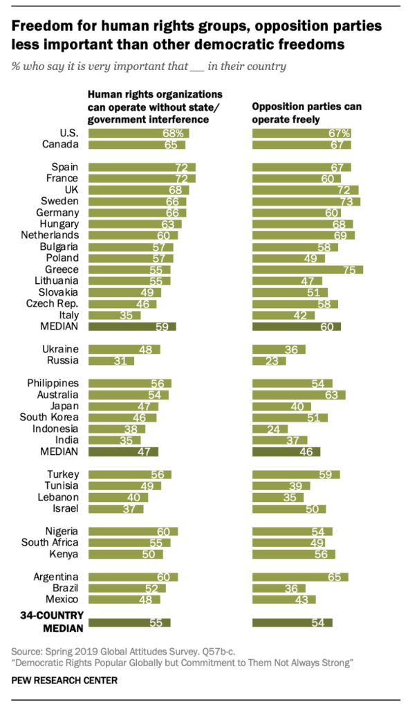 But what substantial portions of the public view as very important appears to be rather different than in some other electoral democracies. Here are questions on the importance of freedom from state interference for human rights organizations and opposition parties:
