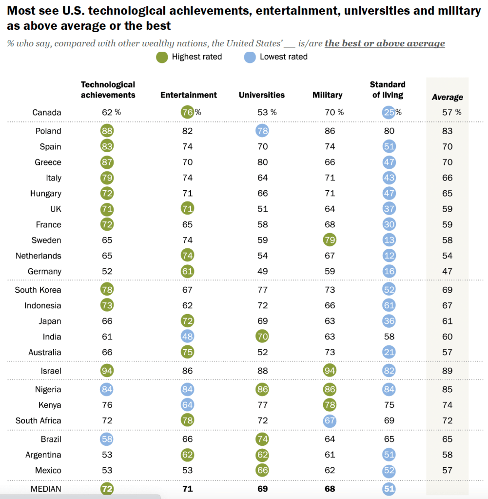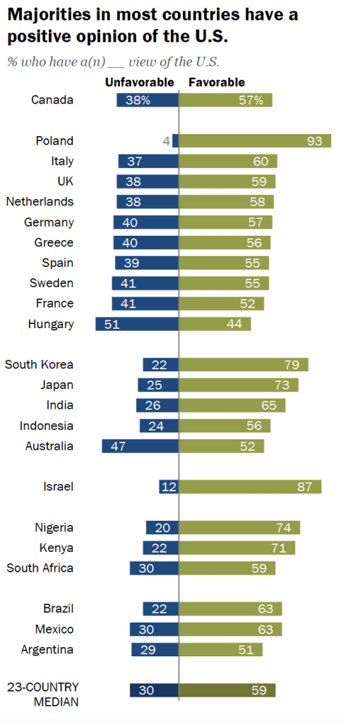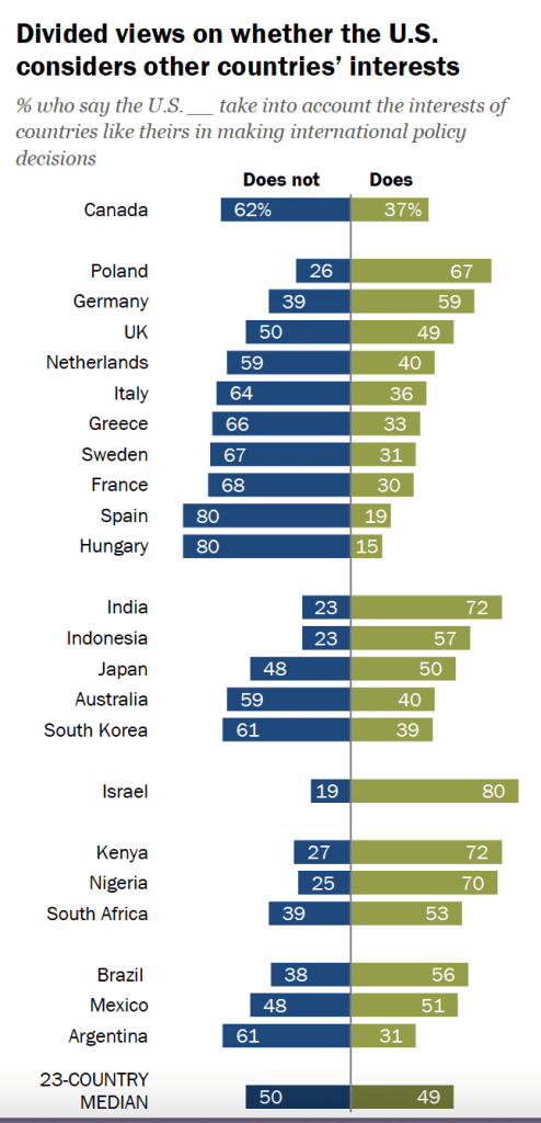 Third, an unusually high percentage of Indians think the US considers their country’s interests (Indians also overwhelmingly think the US contributes to peace and stability around the world, at 70%):