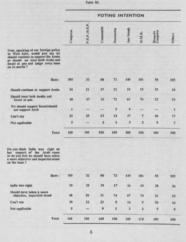 This is an interesting IIOPO survey on Indian views of the government’s policy toward the 1967 crisis/war in the Middle East in July 1967 among respondents in four metros (Delhi, Kolkata, Chennai, Mumbai), broken down by expressed voting intention. While in most of our work we are not seeing consistent partisan differences in foreign policy views (i.e. in views of the US or USSR/Russia), this is one in which we do see some differences between parties and general ideological inclinations (i.e. compare Swatantra and Jan Sangh to Congress and especially Communists).