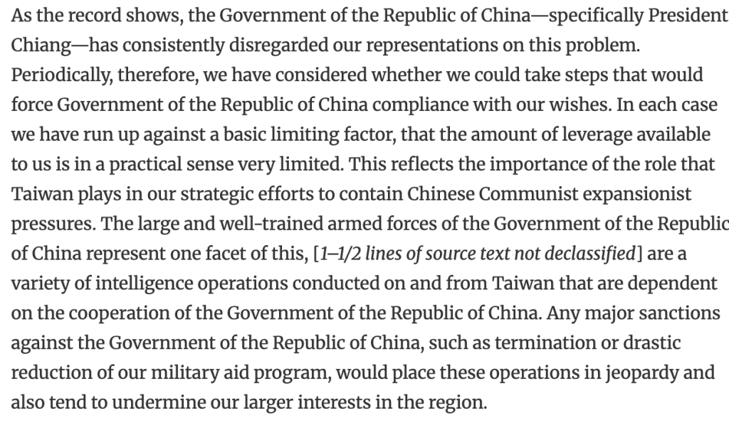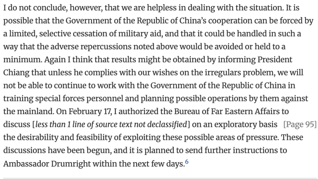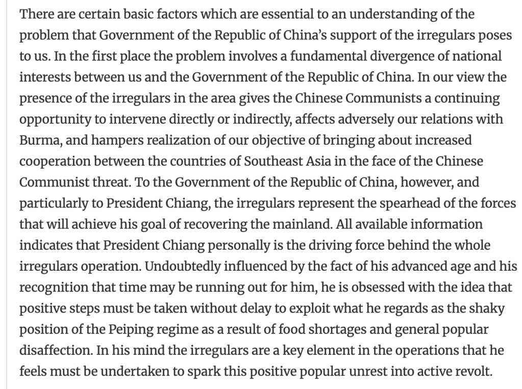 Another version of this dilemma can be found in Taiwanese backing for anti-CCP forces in northern Burma/Myanmar in the 1950s. The Taiwanese pulled forces out under pressure in 1953-54, but got back to it in the late 1950s (also with Thai backing), much to American chagrin. This is a useful analytical paper by the State Department in February 1961 laying out the leverage problem and a possible way forward (which ultimately mostly worked):