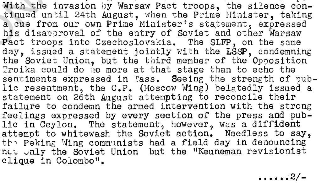 This is a summary – from the August 1968 monthly political report from the Indian High Commission in Colombo – of disagreements within the Sri Lankan left over the Soviet intervention in Czechoslovakia in 1968. I had to google “Keuneman revisionist clique” – apparently it was what the pro-Moscow, electorally-inclined faction of the Communist Party of Sri Lanka was called by its left critics. For a really deep dive, this 1974 book by an “anti-revisionist” Sri Lankan Marxist regularly uses the term, while also highlighting “the Marxist-Leninist Communist Party alone warned against placing faith in the fraud of bourgeois parliamentary democracy” and lamenting how “Khrushchov [sic] usurped power by means of a palace revolution and embarked on the treacherous course of modern revisionism, abandoning the revolutionary principles of Marxism-Leninism.”